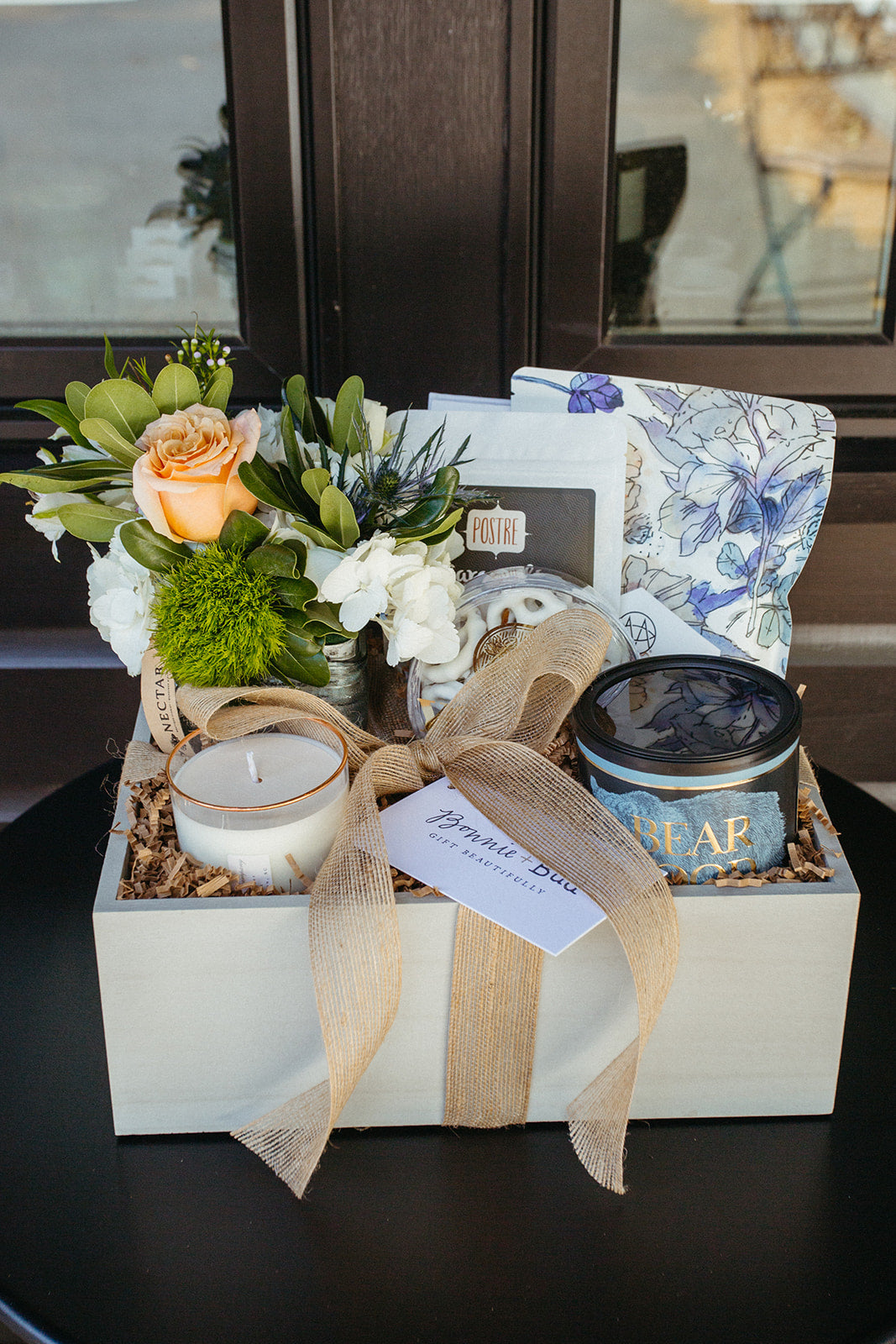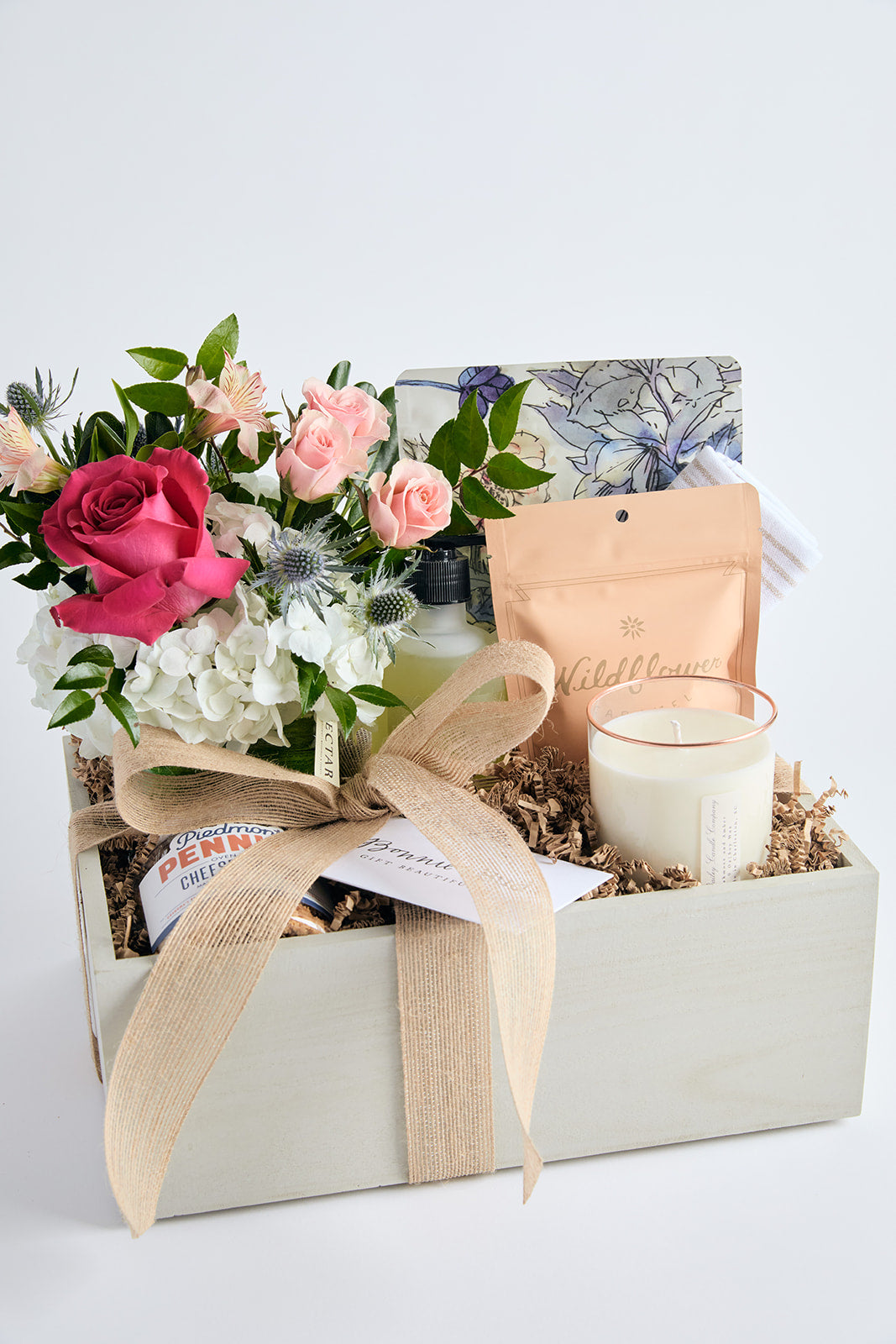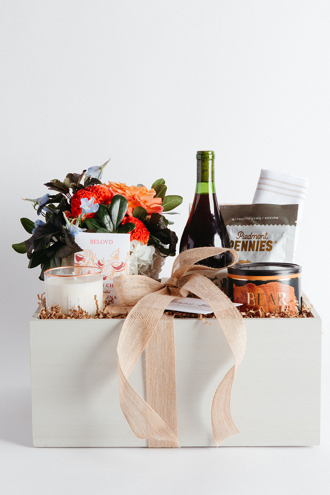 Available for local Charlotte delivery only, these gifts are packaged in an open top wooden box with jute ribbon and include fresh flowers to elevate the experience. Tell us about your needs, and we'll custom design a gift box for the recipient and occasion.