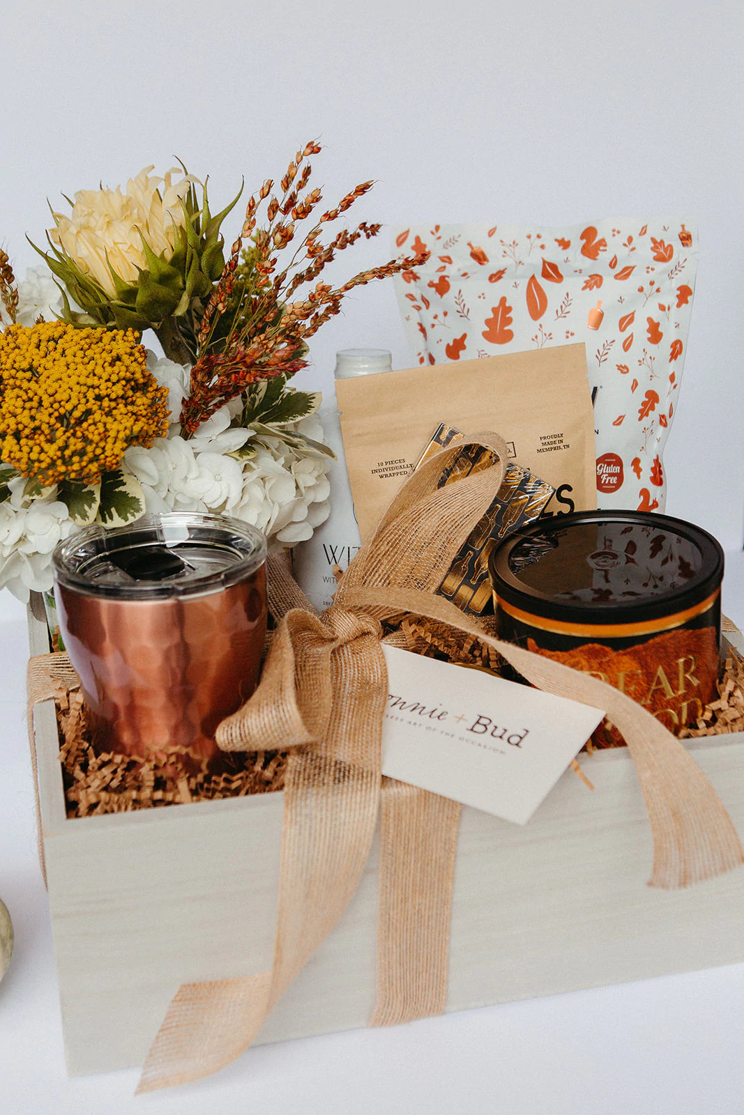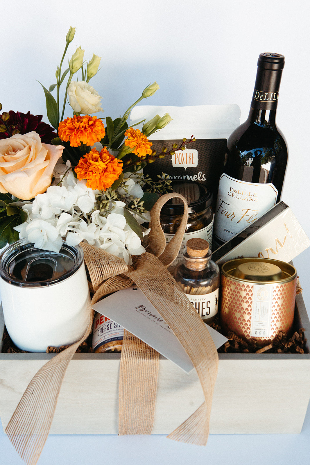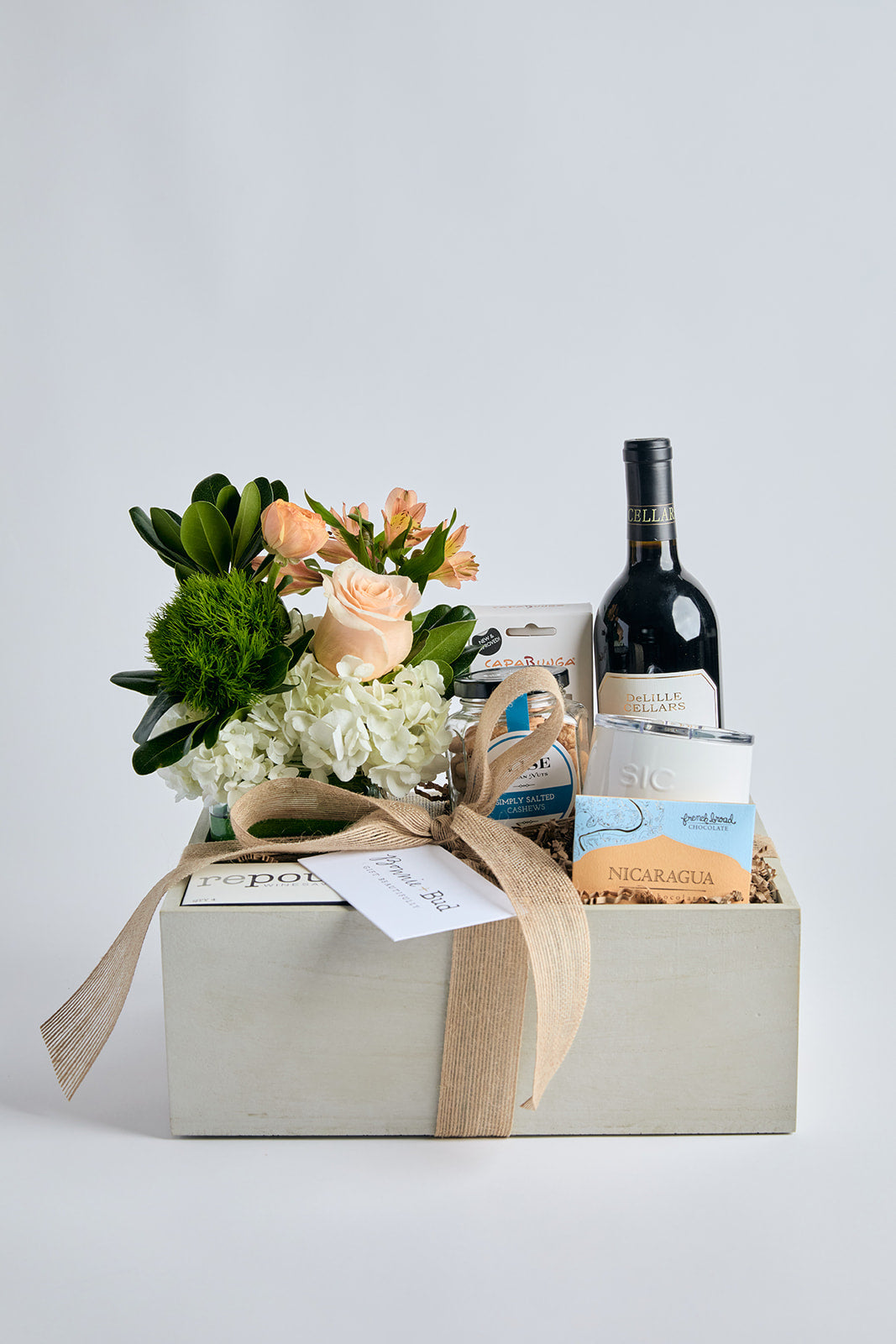 Available for local Charlotte delivery only, these gifts are packaged in an open top wooden box with jute ribbon and include fresh flowers to elevate the experience. Tell us about your needs, and we'll custom design a gift box for the recipient and occasion.