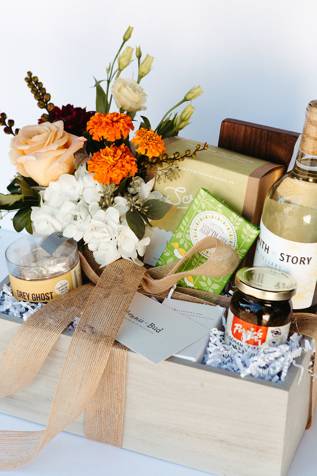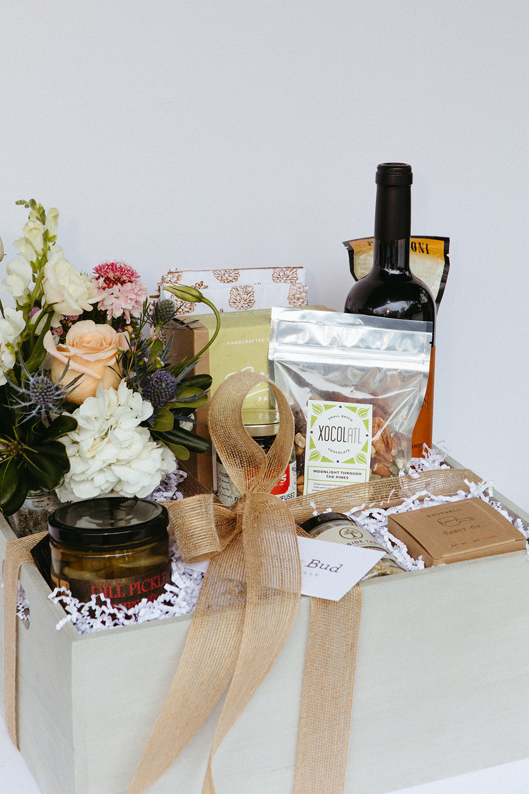 Available for local Charlotte delivery only, these gifts are packaged in an open top wooden box with jute ribbon and include fresh flowers to elevate the experience. Tell us about your needs, and we'll custom design a gift box for the recipient and occasion.
