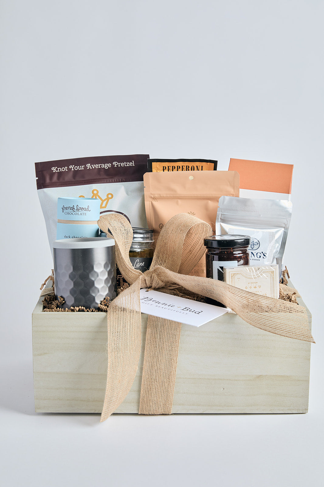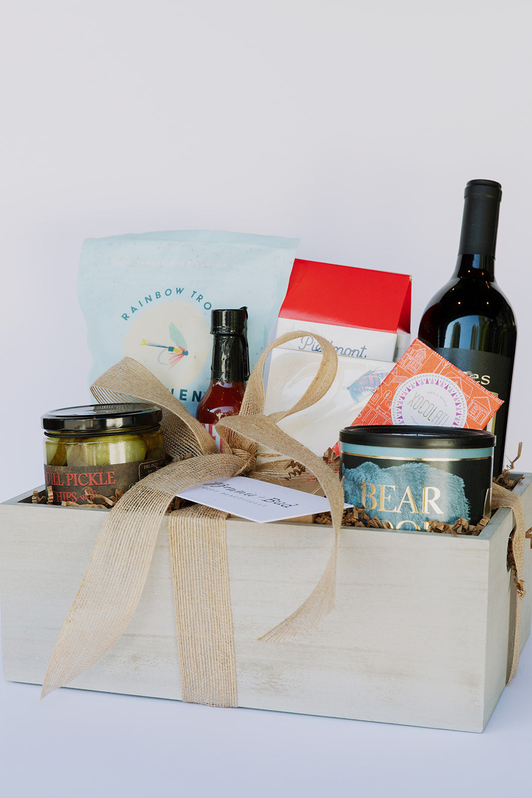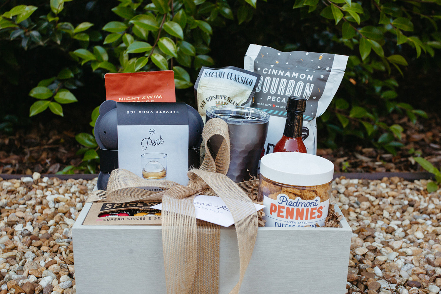 Available for local Charlotte delivery only, these gifts are packaged in an open top wooden box with jute ribbon. Tell us about your needs, and we'll custom design a gift box for the recipient and occasion. Please note if you would like to include fresh flowers in your gift.