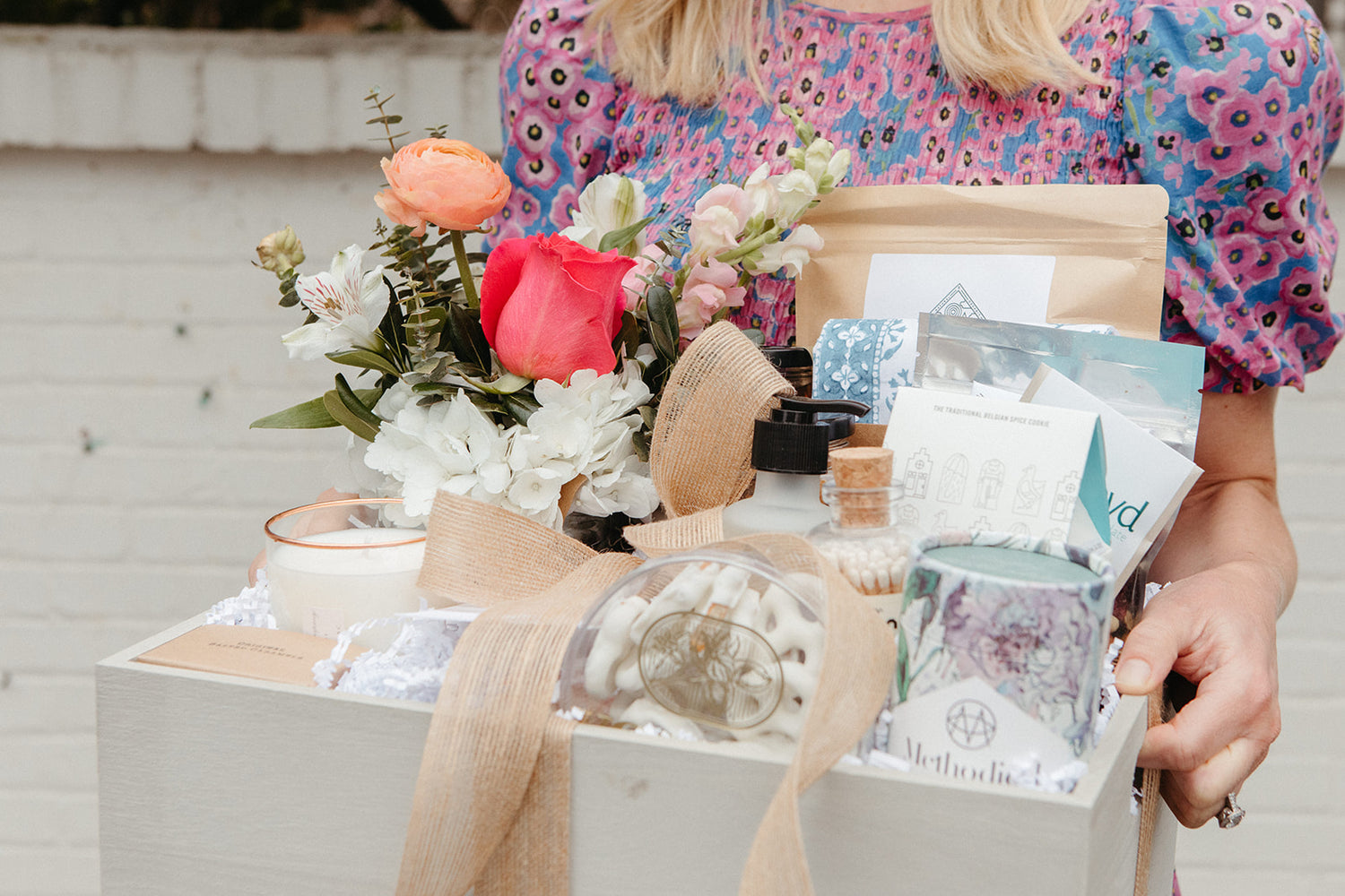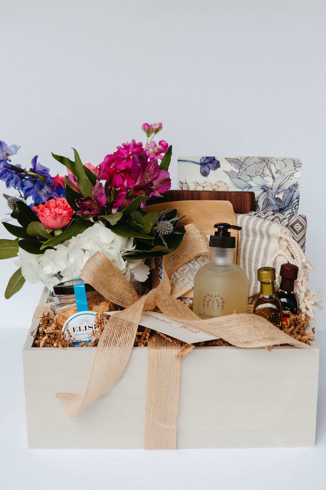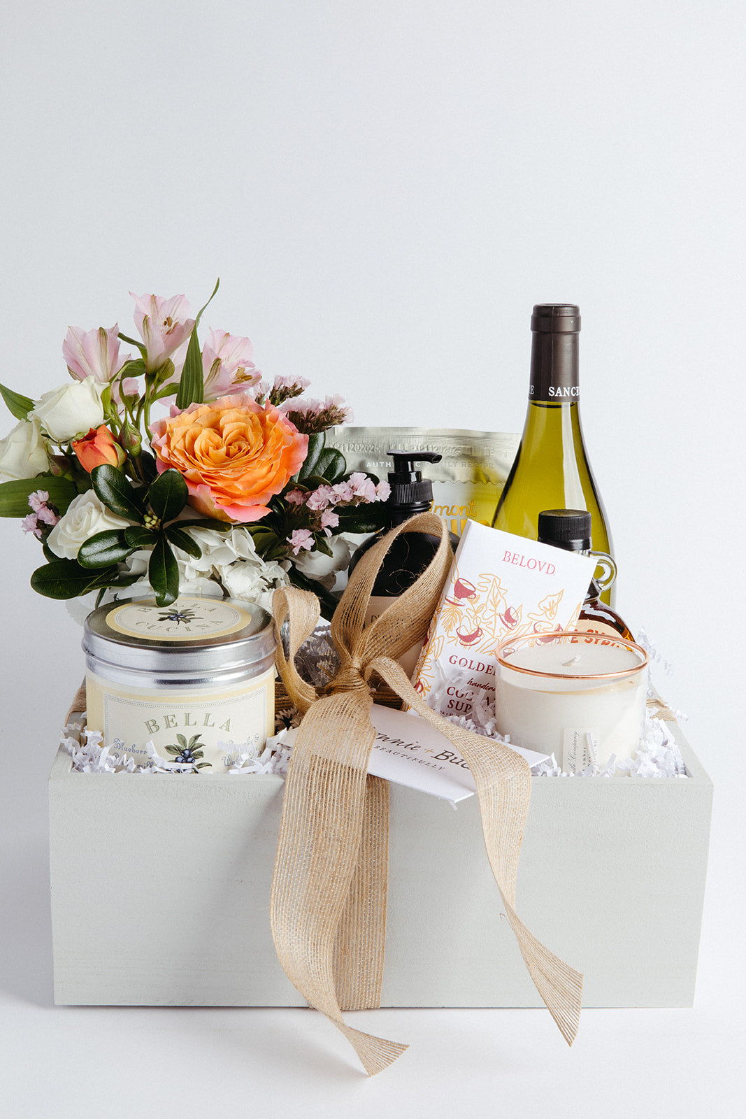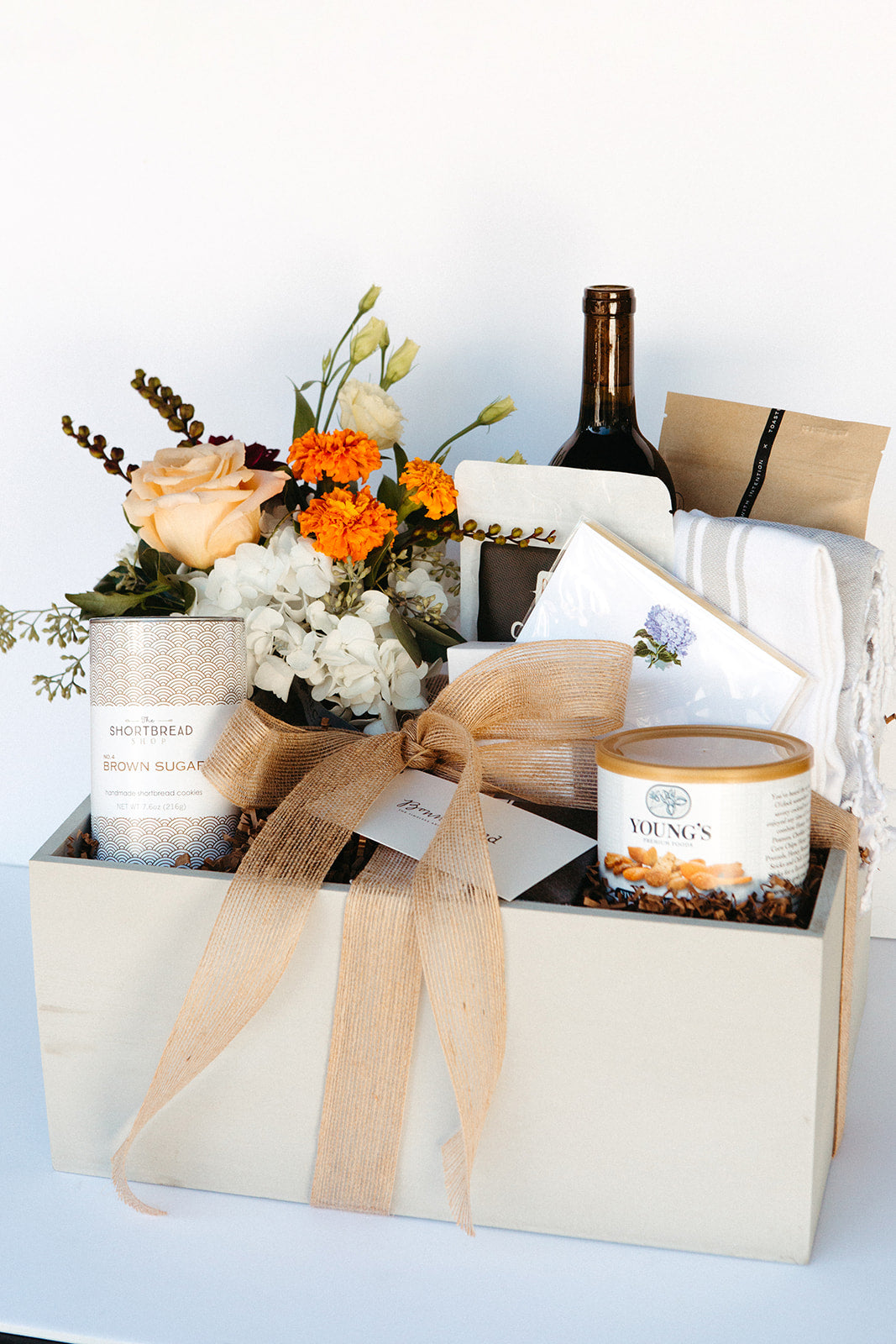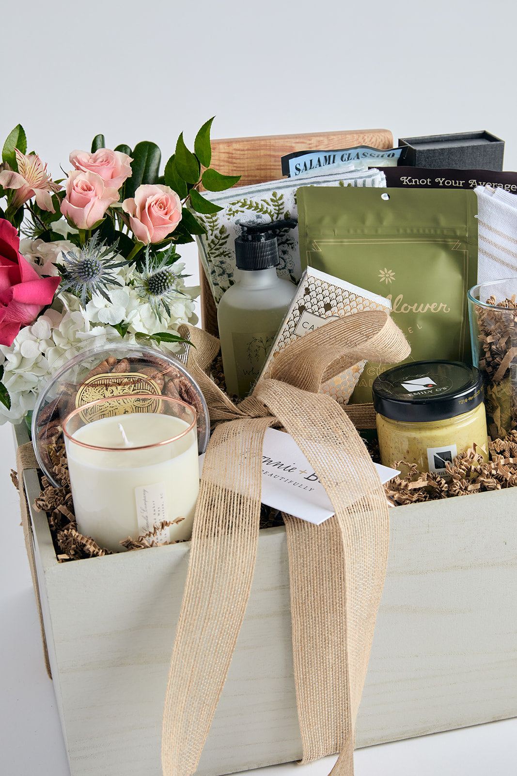 Available for local Charlotte delivery only, these gifts are packaged in an open top wooden box with jute ribbon and include fresh flowers to elevate the experience. Tell us about your needs, and we'll custom design a gift box for the recipient and occasion.