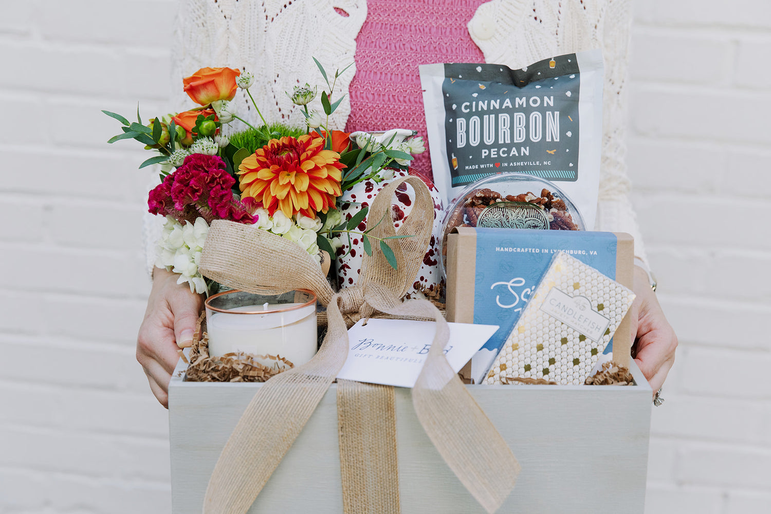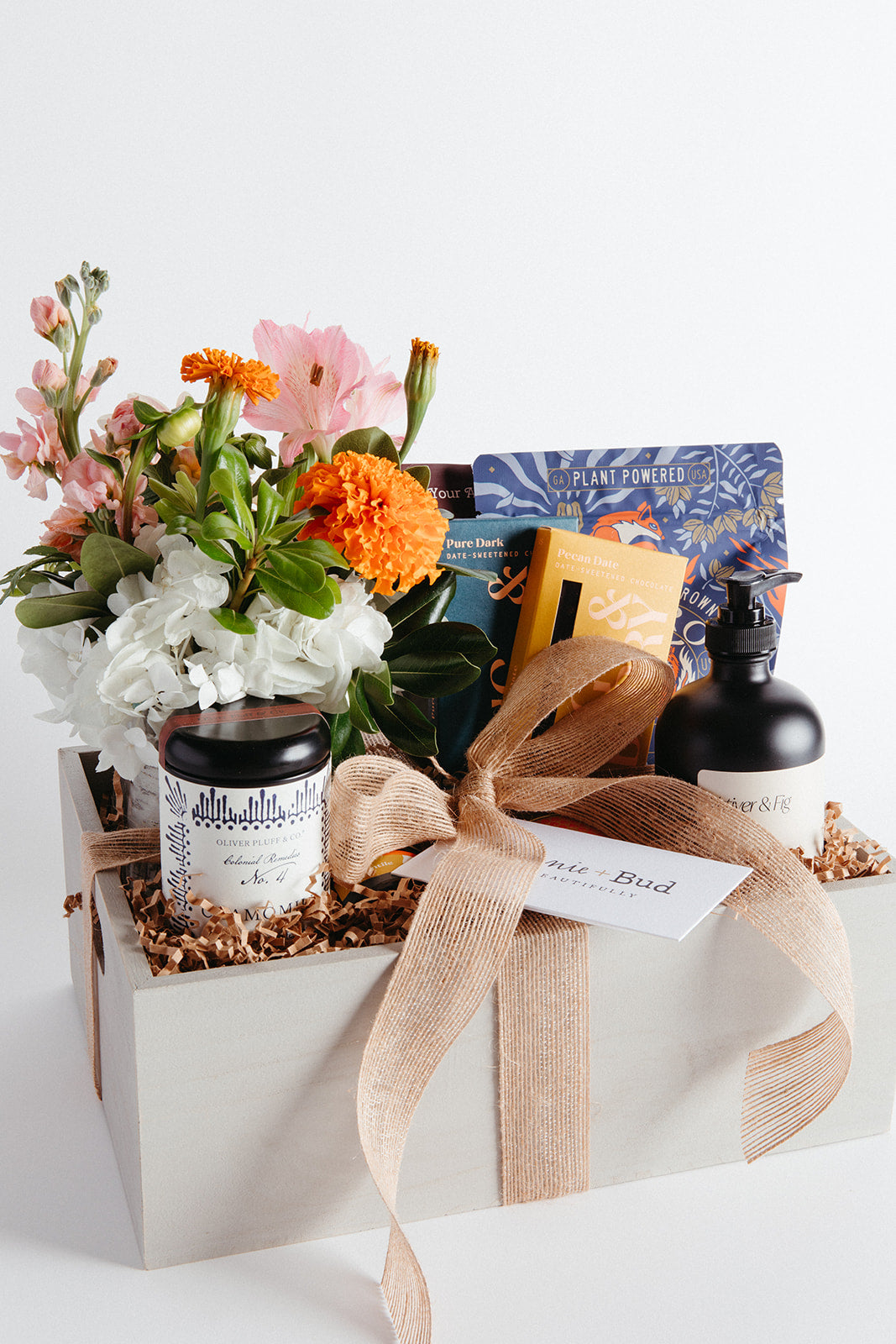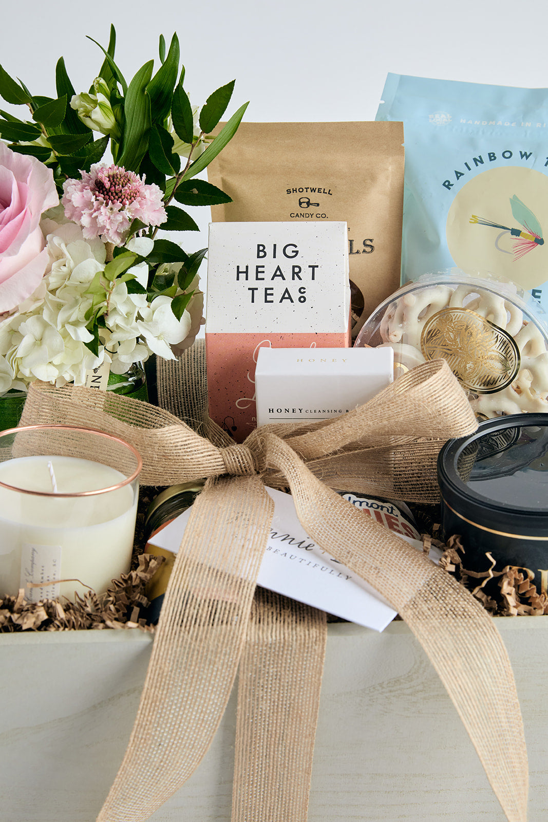 Available for local Charlotte delivery only, these gifts are packaged in an open top wooden box with jute ribbon and include fresh flowers to elevate the experience. Tell us about your needs, and we'll custom design a gift box for the recipient and occasion.