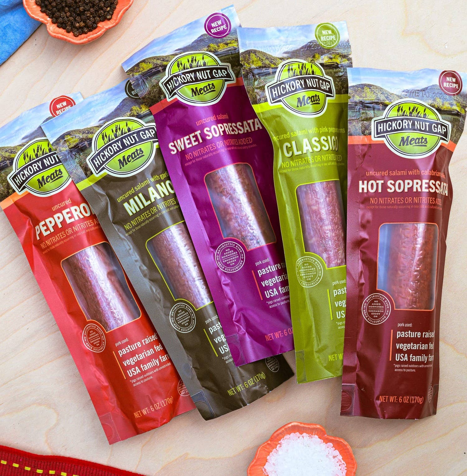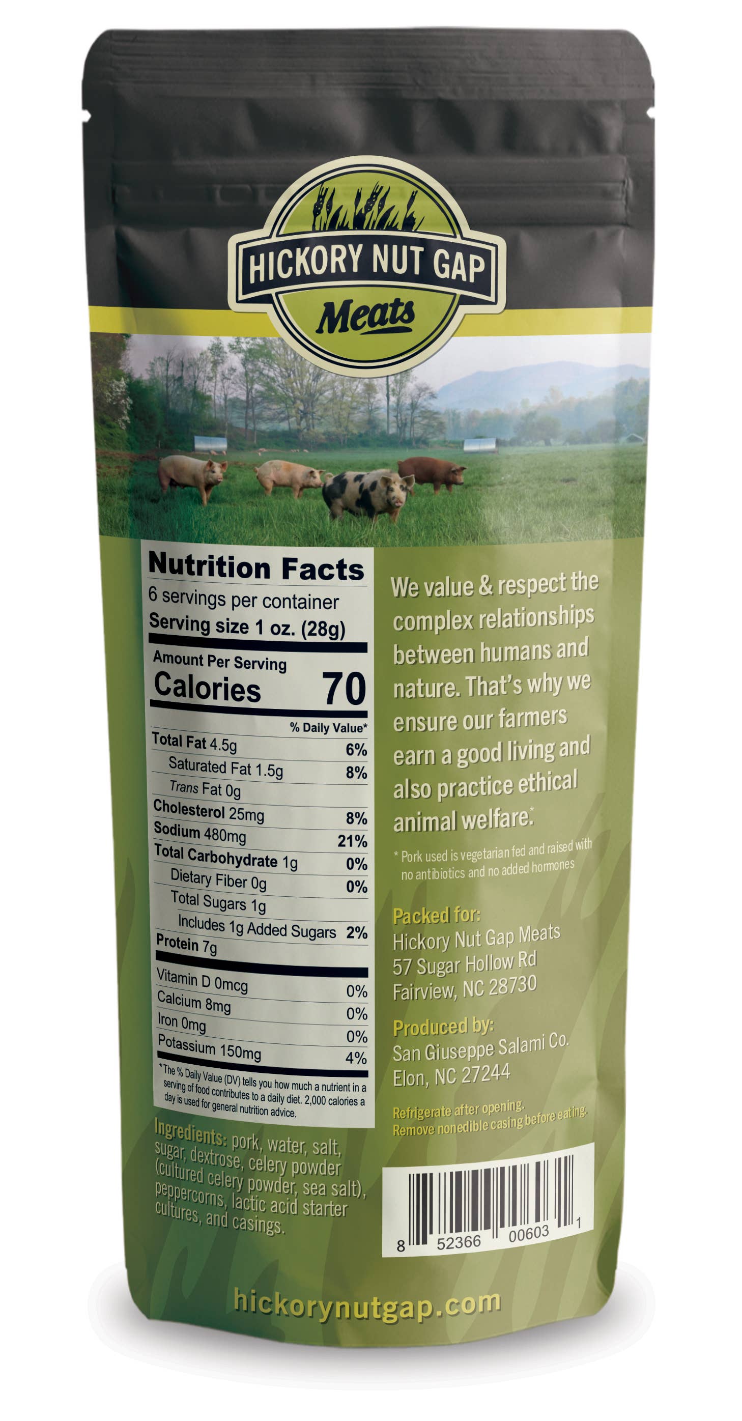 Hickory Nut Gap Classico Salami is a delicious blend of traditional flavors and pasture raised, sustainable meats. Clean crafted with care and expertise, each slice offers familiar and deep, nutty flavor with highlights of pink peppercorn. Perfect for elevating charcuterie boards, sandwiches, and pasta dishes. Made exclusively from humanely raised pork and seasoned to highlight the flavor of the pork, this artisanal salami embodies our commitment to quality, taste, and ethical farming practices. NO ANTIBIOTICS | NO ADDED HORMONES | VEGETARIAN FED | BORN & RAISED IN USA | GLUTEN FREE | NITRATE FREE Ingredients: Pasture Raised Pork, sea salt, wine, spices, cultured celery powder, dextrose, garlic, lactic acid starter culture.