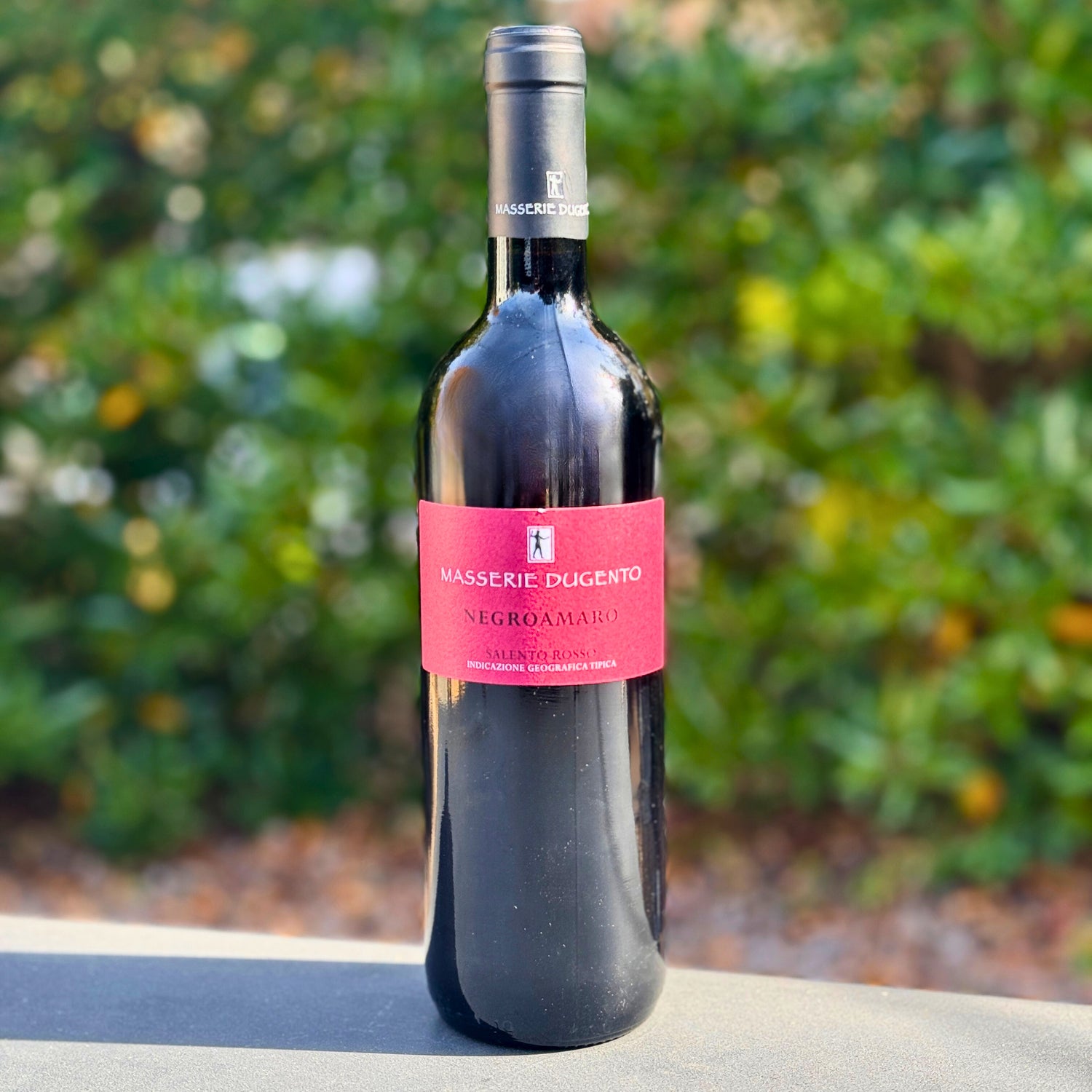 Masserie Dugento’s Negroamaro Salento Rosso channels the sun-soaked energy of Puglia into a dark, complex, and wildly satisfying red. Grown in the warm, coastal breezes of Salento on soils laced with limestone, iron-rich clay, and pockets of sand this Negroamaro ripens to deep concentration while still holding onto its trademark savory edge. The wine opens with bold aromas of black plum, macerated cherry, and blackberry compote, layered with notes of tobacco leaf, dried Mediterranean herbs, and a faint whisper of sea salt carried in from the Adriatic. On the palate it’s plush but not heavy, with velvety tannins and a juicy, mouthfilling core of dark fruit balanced by a pleasantly bitter, amaro-like twist on the finish (a hallmark of the grape). A short rest in neutral wood rounds the texture without dulling its vibrant, sun-drenched personality. It shines alongside hearty Southern Italian dishes like grilled lamb, wood-fired pizza with spicy sausage, slow-braised meats, or richly spiced tomato sauces. Though versatile with a range of traditional Italian fare it’s equally compelling on its own as an easy-drinking, full-flavored weeknight red capturing the soul of Puglia in every glass.